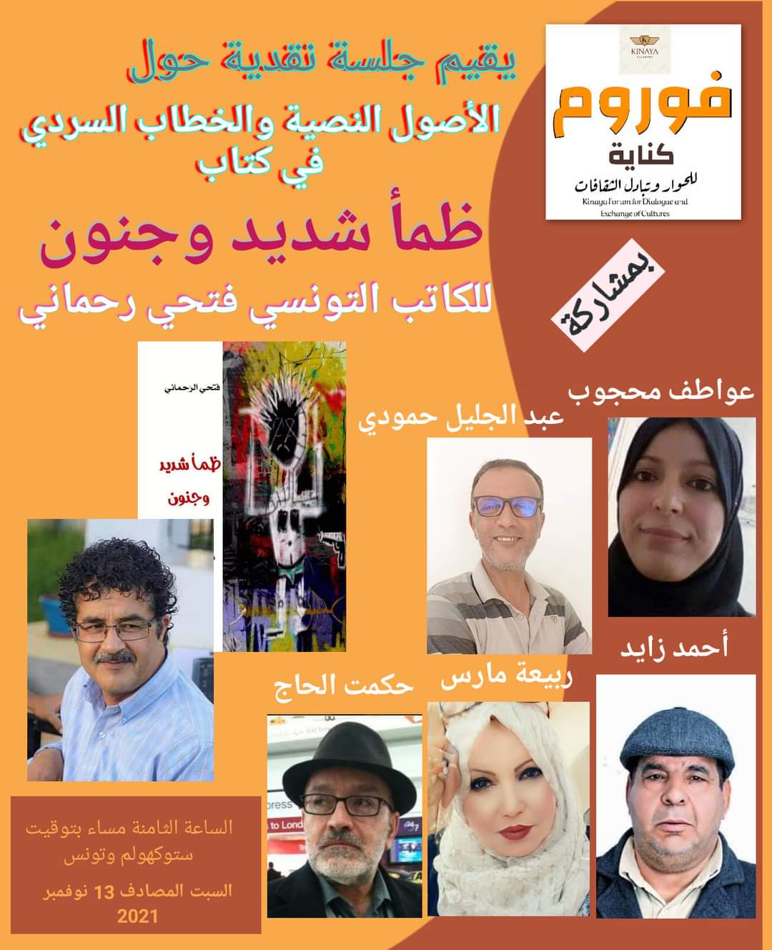 تحت عنوان “الأصول النصية والخطاب السردي في كتاب “ظمأ شديد وجنون”، وعبر تقنية زووم للقاءات الافتراضية عن بعد، ينتظم لقاء نقدي وجلسة عصف ذهني، ضمن أنشطة “فوروم كناية للحوار وتبادل الثقافات” المنبثق عن مجلة “كناية” الرقمية الثقافية المستقلة الصادرة في السويد، وذلك مساء السبت، 13 نوفمبر، على الساعة الثامنة مساء بتوقيت ستوكهولم وتونس، للاحتفاء بتجربة الكاتب التونسي فتحي رحماني وكتابه المتضمن نصوصا سردية قصيرة بعنوان: “ظمأ شديد، وجنون”، بحضور ثلة من الناقدات والنقاد وهم على التوالي: الشاعرة ربيعة مارس، القاصة عواطف محجوب، الناقد أحمد زايد، الناقد عبد الجليل حمودي والشاعر حكمت الحاج.