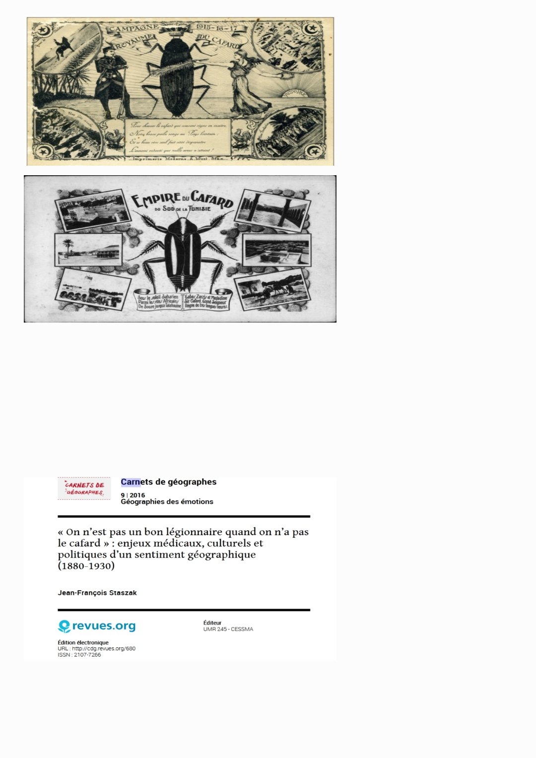 · الدراسة الأولى اختار لها ( ستازاك ) عنوانا هو التالي ” رهانات طبيّة وثقافية وسياسية في مواجهة شعور جغرافي بين 1880- 1930 “، وقد تتبّع في دراسته هذه ما عرف في علم النفس الكولونيالي أو علم نفس المستعمرات بـ ” داء الصرصور” أو ” متلازمة الصرصور “، وبيّن كيف ارتبطت هذه الحالة النفسيّة بالمناخ والمحيط في مستعمرات فرنسا وخاصّة في شمال أفريقيا ( الجزائر وتونس تحديدا).