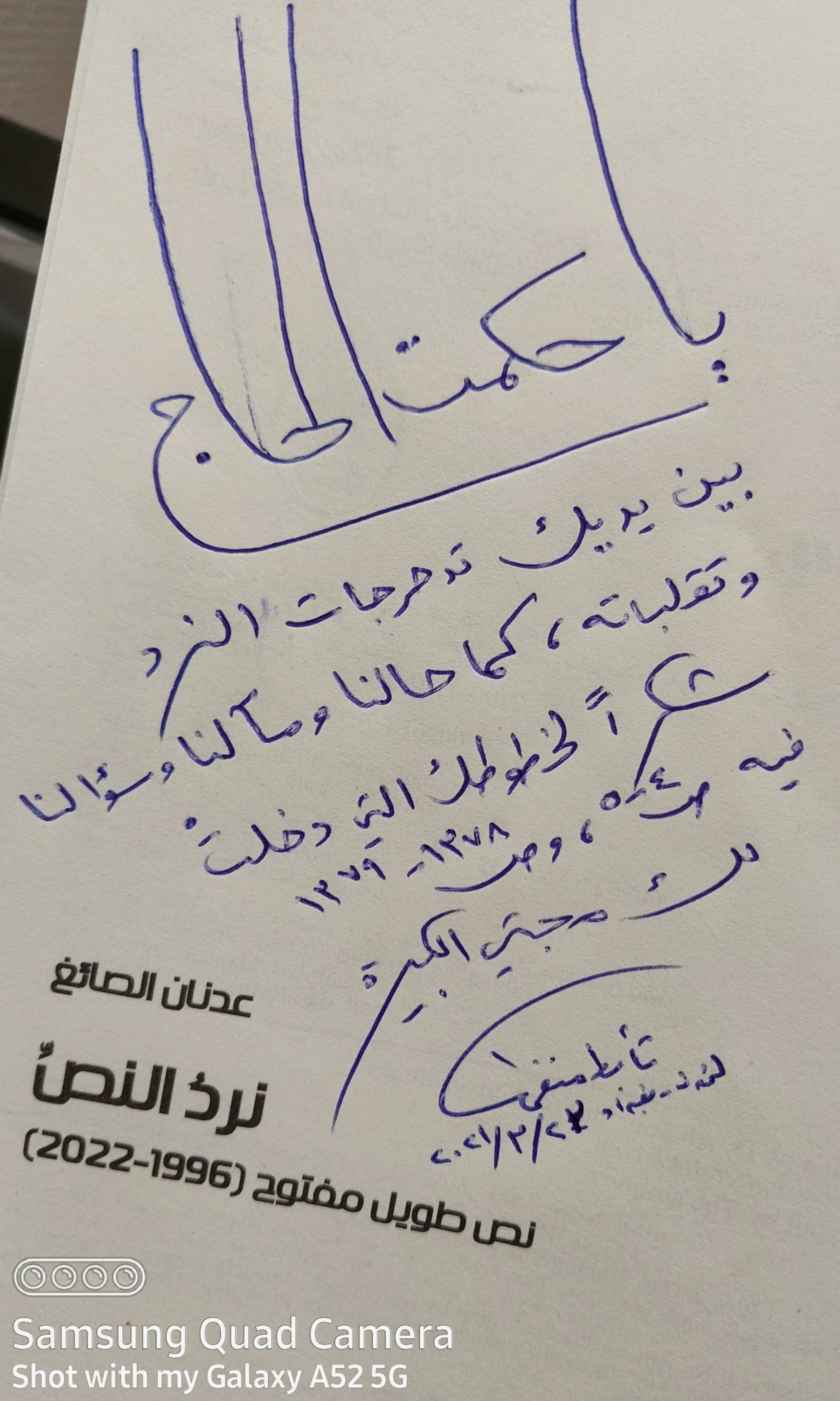 واليوم، وقد وصلني عبر البريد هذا الكتاب الغريب العجيب، نرد النص، بدأت أدرك رويدا رويدا، وأنا أفض المظاريف وأتلمس هيئة الكتاب، وأشم رائحة الورق، ما كان يقوله لي الشاعر عدنان الصائغ عن مشروعه الشعري هذا الذي استغرقه كتابة وعمرا ومشغلة منذ عام 1996 وبدون توقف، حتى زمن صدوره مطلع هذا العام 2022.