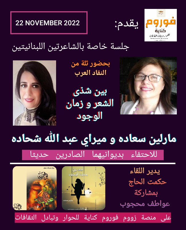 كلمة الأستاذ الأديب ناجي نعمان في أُمسِيَة "فوروم كناية للحوار وتبادل الثقافات" التي انتظمت مساء 22 نوفمبر 2023 وذلك احتفاء بالشاعرتين اللبنانيتين مارلين سعادة وميراي شحادة حدَّاد
