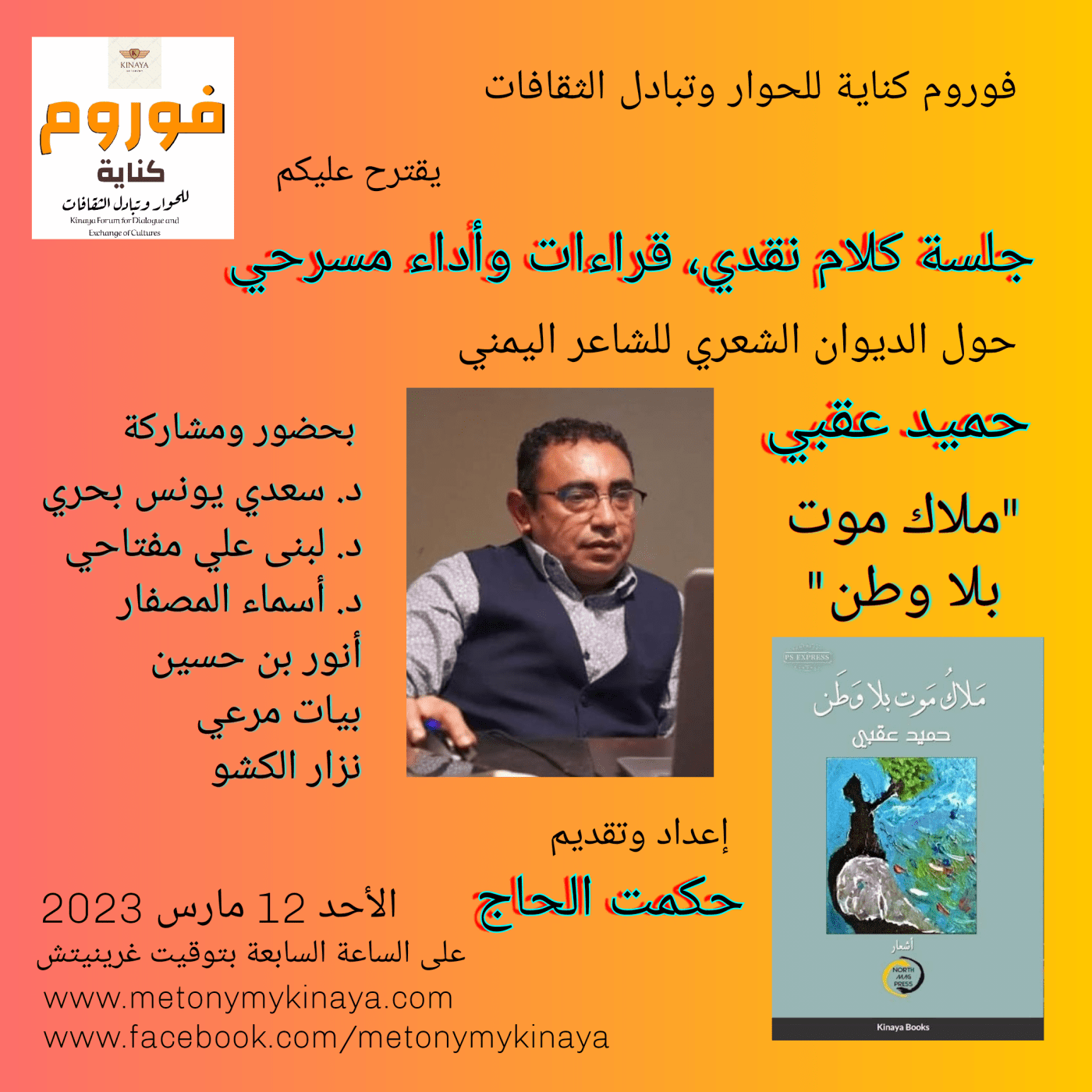 ضمن فعاليات الندوة النقدية الأدائية التي ينظمها فوروم كناية للحوار وتبادل الثقافات للاحتفاء بصدور ديوان ملاك موت بلا وطن للشاعر اليمني حميد عقبي عن منشورات كناية وذلك مساء يوم الأحد 12 مارس آذار بحضور ومشاركة د. سعدي يونس بحري، د. أسماء المصفار، د. لبنى علي مفتاحي، بيات مرعي، أنور بن حسين، نزار الكشو، حميد عقبي. يعد اللقاء ويقدمه حكمت الحاج