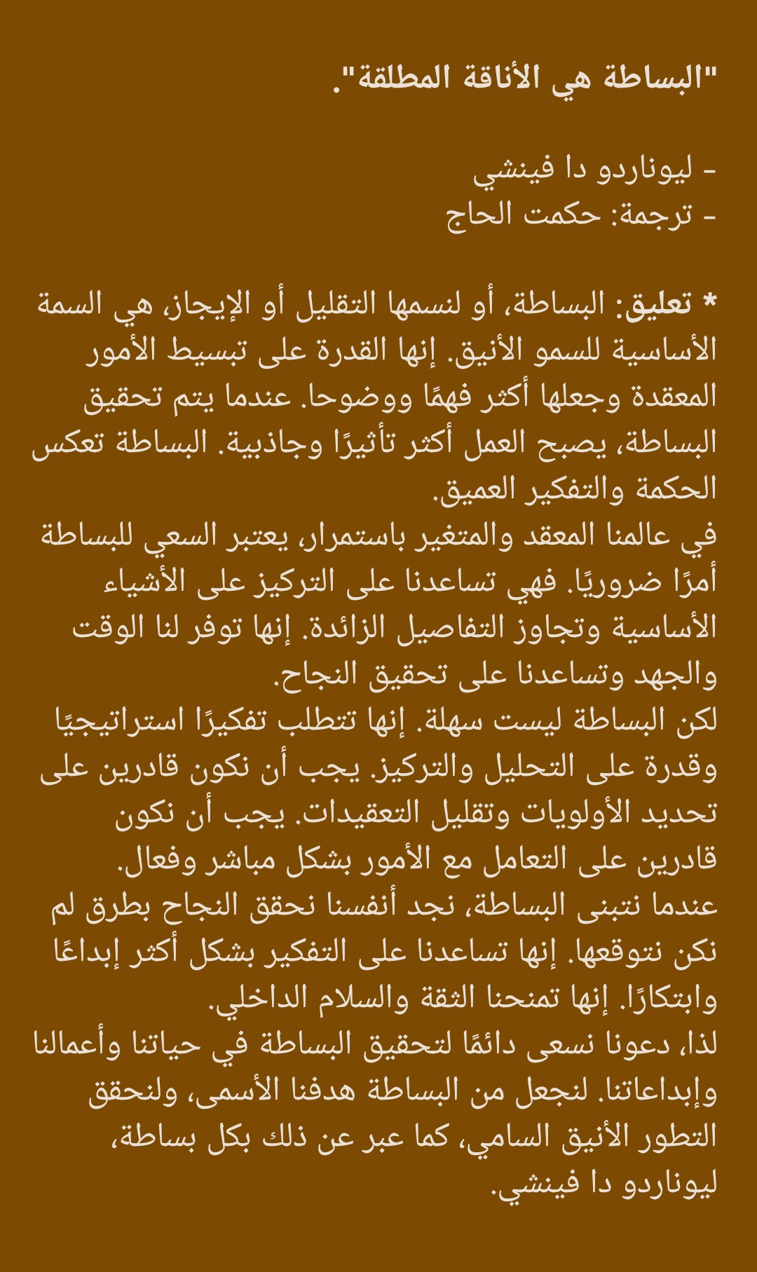 البساطة، أو لنسمها التقليل أو الإيجاز، هي السمة الأساسية للسمو الأنيق. إنها القدرة على تبسيط الأمور المعقدة وجعلها أكثر فهمًا ووضوحا. عندما يتم تحقيق البساطة، يصبح العمل أكثر تأثيرًا وجاذبية. البساطة تعكس الحكمة والتفكير العميق. في عالمنا المعقد والمتغير باستمرار، يعتبر السعي للبساطة أمرًا ضروريًا. فهي تساعدنا على التركيز على الأشياء الأساسية وتجاوز التفاصيل الزائدة. إنها توفر لنا الوقت والجهد وتساعدنا على تحقيق النجاح. لكن البساطة ليست سهلة. إنها تتطلب تفكيرًا استراتيجيًا وقدرة على التحليل والتركيز. يجب أن نكون قادرين على تحديد الأولويات وتقليل التعقيدات. يجب أن نكون قادرين على التعامل مع الأمور بشكل مباشر وفعال. عندما نتبنى البساطة، نجد أنفسنا نحقق النجاح بطرق لم نكن نتوقعها. إنها تساعدنا على التفكير بشكل أكثر إبداعًا وابتكارًا. إنها تمنحنا الثقة والسلام الداخلي. لذا، دعونا نسعى دائمًا لتحقيق البساطة في حياتنا وأعمالنا وإبداعاتنا. لنجعل من البساطة هدفنا الأسمى، ولنحقق التطور الأنيق السامي، كما عبر عن ذلك بكل بساطة، ليوناردو دا فينشي.