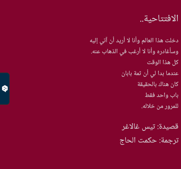 الافتتاحية.. دخلت هذا العالم وأنا لا أريد أن آتي إليه وسأغادره وأنا لا أرغب في الذهاب عنه. كل هذا الوقت عندما بدا لي أن ثمة بابان كان هناك بالحقيقة باب واحد فقط للمرور من خلاله. قصيدة الشاعرة الأمريكية: تيس غالاغر ترجمة: حكمت الحاج * وانظر ما قاله شاعرنا الكبير الراحل صلاح چاهين في احدى رباعياته:... المزيد ←