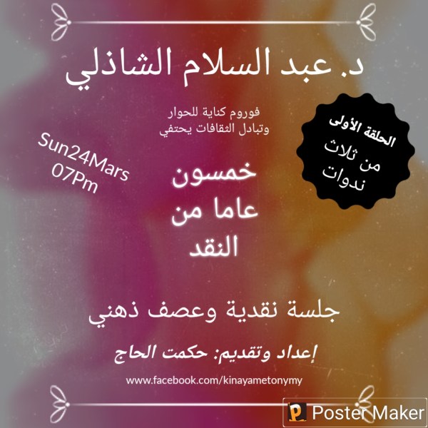 (*نص الكلمة التي ألقاها حكمت الحاج في مستهل الندوة التي أقيمت لتكريم د. عبد السلام الشاذلي مساء يوم 24 مارس 2024 على فوروم كناية للحوار وتبادل الثقافات). يسرني أن أرحب بكم في ندوة فريدة من ندوات "فوروم كناية للحوار وتبادل الثقافات"، حيث سنحتفي بمسيرة نصف قرن من العطاء الفكري والنقدي لشخصية استثنائية في عالم الأدب... المزيد ←