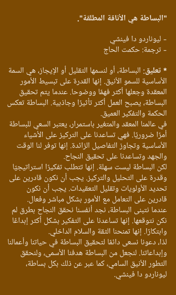 "البساطة هي الأناقة المطلقة". - ليوناردو دا فينشي - حكمت الحاج * البساطة، أو لنسمها التقليل أو الإيجاز، هي السمة الأساسية للسمو الأنيق. إنها القدرة على تبسيط الأمور المعقدة وجعلها أكثر فهمًا ووضوحا. عندما يتم تحقيق البساطة، يصبح العمل أكثر تأثيرًا وجاذبية. البساطة تعكس الحكمة والتفكير العميق. في عالمنا المعقد والمتغير باستمرار، يعتبر السعي للبساطة... المزيد ←