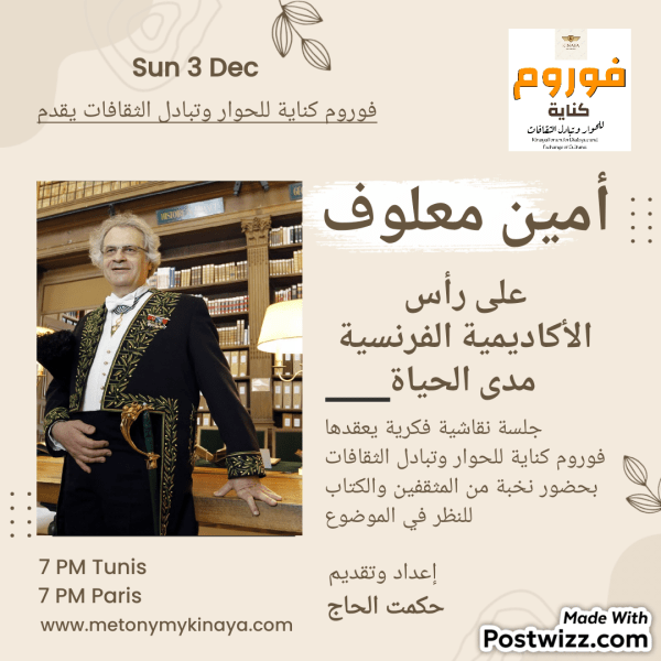 ..........ضيف ندوة فوروم كناية للحوار وتبادل الثقافات Kinaya Metonymy لهذا الشهر هو: * أمين معلوف، الكاتب الفرنسي من أصل لبناني، حصل على رئاسة الأكاديمية الفرنسية بفضل تفانيه وتفرغه لأنشطة الأكاديمية منذ انضمامه إليها في عام 2012¹. هذا الالتزام جعله المرشح الأوفر حظًا للمنصب. وقد حصل على ثقة أعضاء الأكاديمية بأغلبية قوية، حيث حصل على 24... المزيد ←