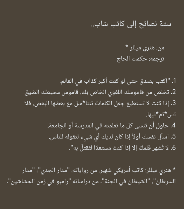 .. من: هنري ميللر * ترجمة: حكمت الحاج 1. "اكتب بصدق حتى لو كنت أكبر كذاب في العالم. 2. تخلص من قاموسك اللغوي الخاص بك، قاموس محيطك الضيق. 3. إذا كنت لا تستطيع جعل الكلمات تتنا*سل مع بعضها البعض، فلا تس*تم*نيها. 4. حاول أن تنسى كل ما تعلمته في المدرسة أو الجامعة. 5. اسأل نفسك... المزيد ←