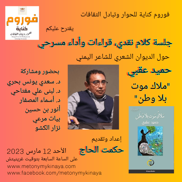 https://youtu.be/JG_PLF9U29s ملاك موت بلا وطن شعر حميد عقبي أداء مسرحي د. سعدي يونس بحري ضمن فعاليات الندوة النقدية الأدائية التي ينظمها فوروم كناية للحوار وتبادل الثقافات للاحتفاء بصدور ديوان ملاك موت بلا وطن للشاعر اليمني حميد عقبي عن منشورات كناية وذلك مساء يوم الأحد 12 مارس آذار بحضور ومشاركة د. سعدي يونس بحري، د. أسماء... المزيد ←