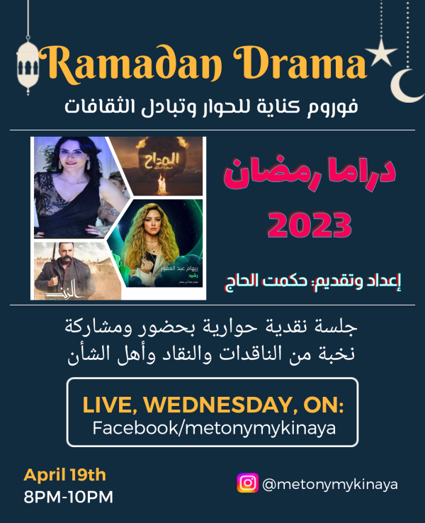 فوروم كناية للحوار وتبادل الثقافات يعقد جلسة حوارية لمناقشة الأعمال الدرامية العربية التي تم تقديها خلال الشهر الفضيل، بحضور ومشاركة نخبة من الناقدات والنقاد من ذوي الإهتمام، ومن إعداد وتقديم حكمت الحاج وذلك في أمسية الأربعاء المصادف 19 نيسان أبريل الجاري، على الساعة العاشرة بتوقيت تونس، التاسعة بتوقيت غرينيتش، وسيتم بث اللقاء مباشرة على صفحة... المزيد ←